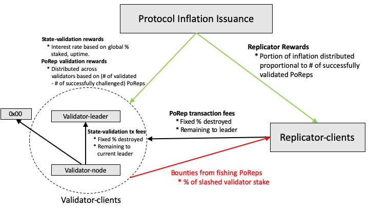 The main channels of participant remittances are referred to as protocol-based (inflationary) rewards and transaction fees. Protocol-based rewards are issuances from a global, protocol-defined, inflation rate. These rewards will constitute the total reward delivered to validation clients, the remaining sourced from transaction fees. In the early days of the network, it is likely that protocol-based rewards, deployed based on predefined issuance schedule, will drive the majority of participant incentives to participate in the network.